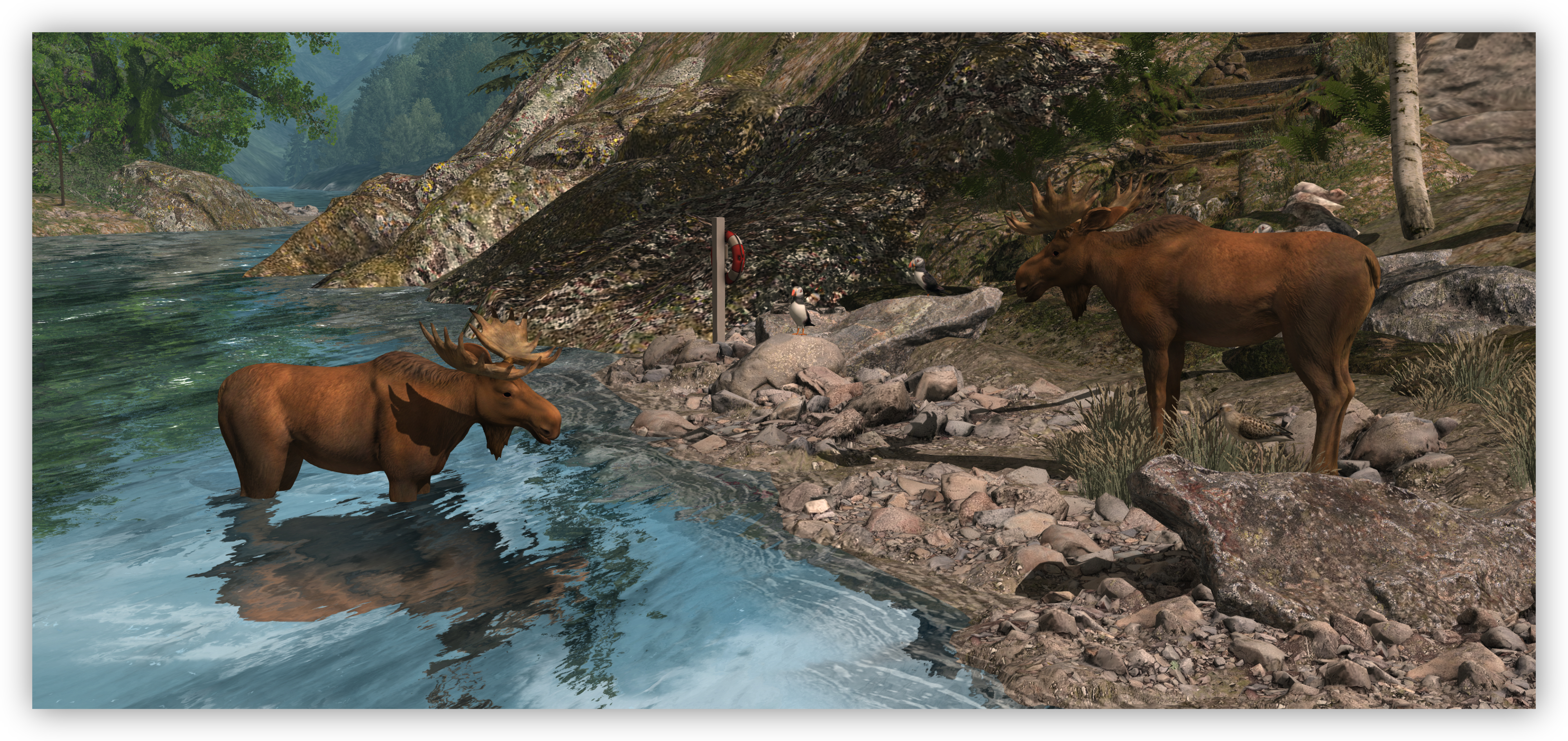 Mit diesem Konzept im Hinterkopf habe ich die Second Life-Version von Sunnmore geschaffen. Genau wie ihr Gegenstück im ersten Leben ist diese Version von Sunnmore dazu gedacht, auf jede erdenkliche Weise erkundet zu werden. Die Hauptfortbewegungsart ist hier das Wasser - mit dem Kajak und dem aufblasbaren Motorboot. Für beides gibt es in jedem Gebiet Anlegestellen. Bei einer Kajaktour um die Insel und durch die Fjorde kommen Sie der Natur näher und können mit ihr interagieren.
